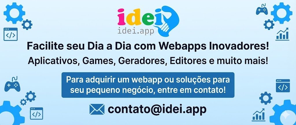 O Idei.app é uma plataforma que desenvolve webapps modernos, rápidos e práticos pensados para facilitar a vida das pessoas e impulsionar pequenos negócios. Criamos aplicativos, jogos, geradores, editores e ferramentas digitais que resolvem problemas reais de forma simples, acessível e eficiente. Nossa missão é transformar ideias em soluções digitais que economizam tempo, aumentam a produtividade e tornam o uso da tecnologia mais fácil para todos.