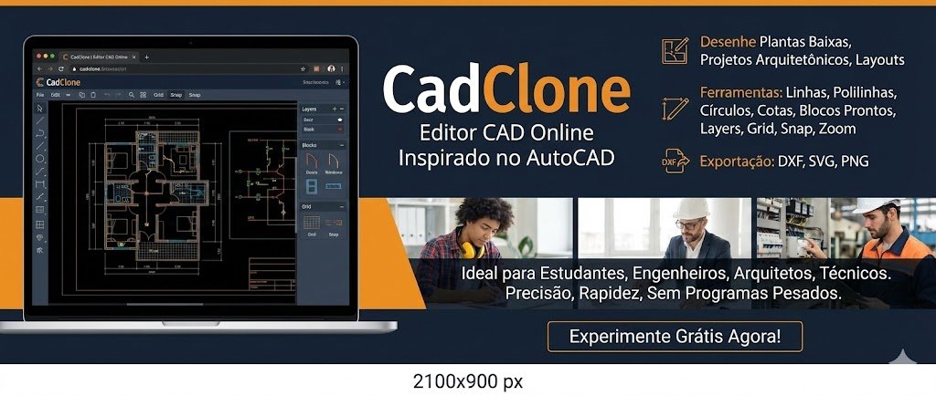 O CadClone é um editor CAD online inspirado no AutoCAD, criado para desenhar plantas baixas, projetos arquitetônicos, layouts, esquemas elétricos e hidráulicos diretamente no navegador. Ele oferece ferramentas como linhas, polilinhas, círculos, cotas, blocos prontos (portas, janelas, móveis), layers, grid, snap, zoom e exportação em DXF, SVG e PNG.