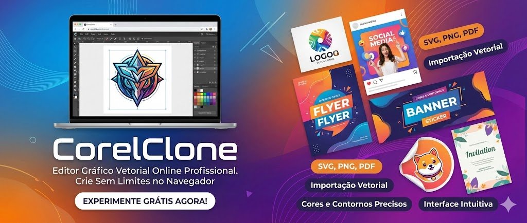 O CorelClone é um poderoso editor gráfico vetorial online que traz para o navegador uma experiência completa de design profissional. Com ele você pode criar logotipos, artes para redes sociais, panfletos, banners, adesivos, convites e muito mais, utilizando ferramentas de desenho, formas geométricas, textos, camadas e alinhamentos precisos.