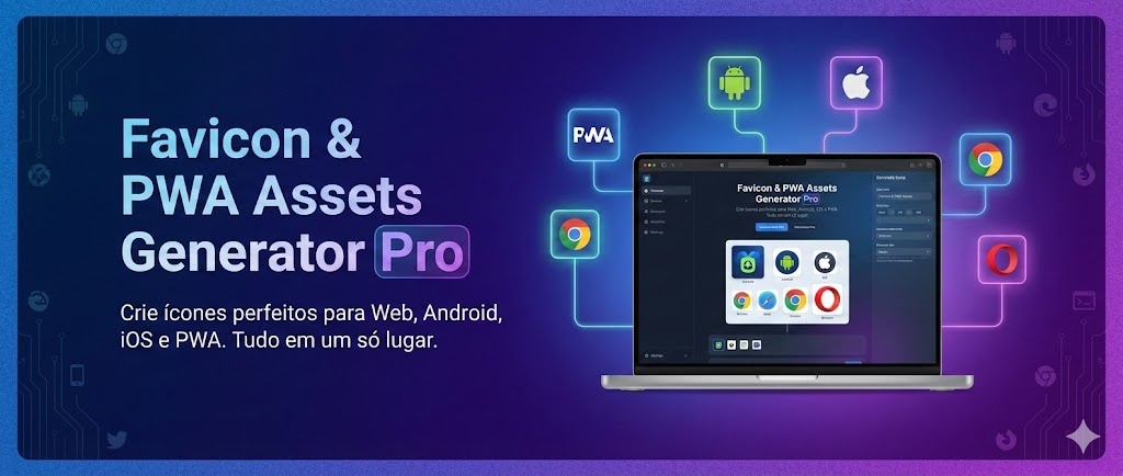 O Gerador de Favicon & PWA Assets é um webapp profissional desenvolvido para criar automaticamente todos os ícones e imagens necessários para sites, aplicativos, PWAs, Android, iOS e navegadores modernos em um único lugar.